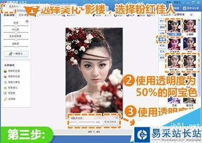 3、进入“美化”菜单下,点击“影楼”分类,分别使用透明度为100%的“粉红佳人”、透明度为50%“阿宝色”和透明度为30%的“淡雅”进行特效叠加,调节画面色调使人物的肤色变得更加白皙动人!