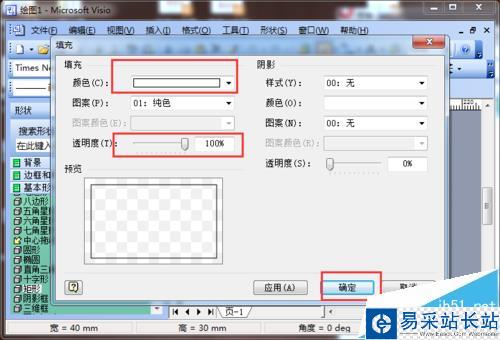 3、设置矩形:将颜色配置成“无色”,经透明度设置为“100%”;