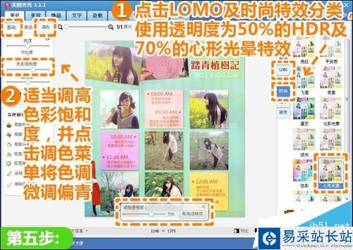5、在“美化”菜单下分别点击“LOMO”及“时尚”特效分类,使用透明度为50%的“HDR”及70%的“心形光晕”特效。适当调高色彩饱和度并将色调微调偏向青色,让整体更融合。