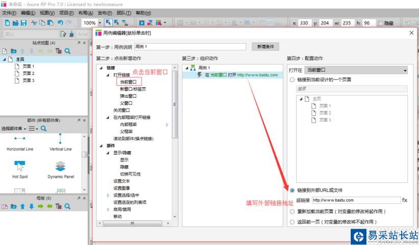 5、弹出用例编辑器,在用例编辑器中可以设定鼠标点击时,触发什么样的效果,这里我们选择在当前窗口打开一个地址链接。如图所示