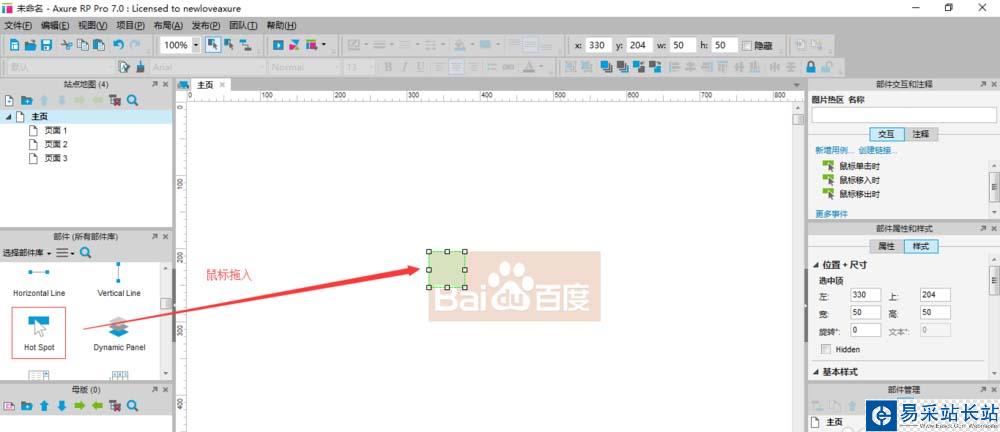 4、同样选中拖入的Hotspot,双击右上方交互功能模块下的‘鼠标单击时’按钮。