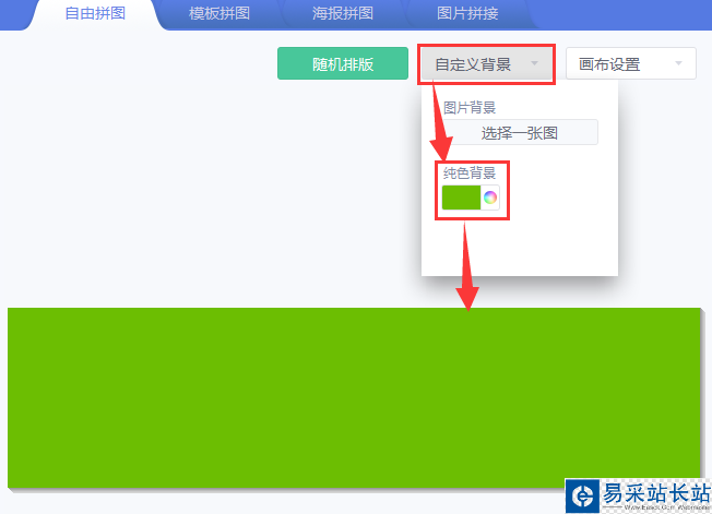 4、在“自由拼图”的右边打开“画布设置”选择自定义尺寸,宽1920高500的像素。
