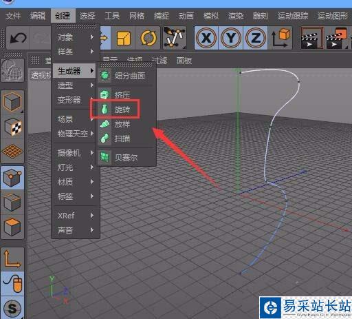 5、绘制好贝塞尔样条线之后我们在菜单里找到创建选项,点击该选项在其子级菜单里找到生成器选项,如图所示: