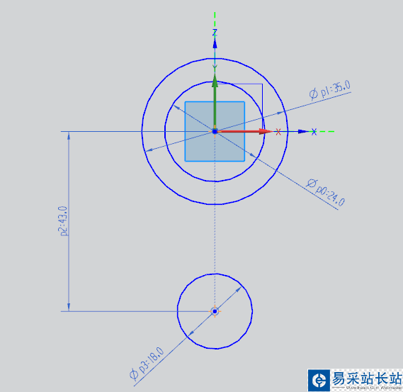 3、在Y的负轴上绘一直径为18的圆,距离原点:43.如果所绘的圆没在Y轴上,可用点在线上进行约束。