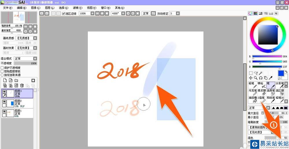 6、另外,如果用的是不彩画笔,要调整画图时的图像透明度,那么就可以通过拉动那个灰色条,增加水分量,也能实现图像透明度调整后的效果。