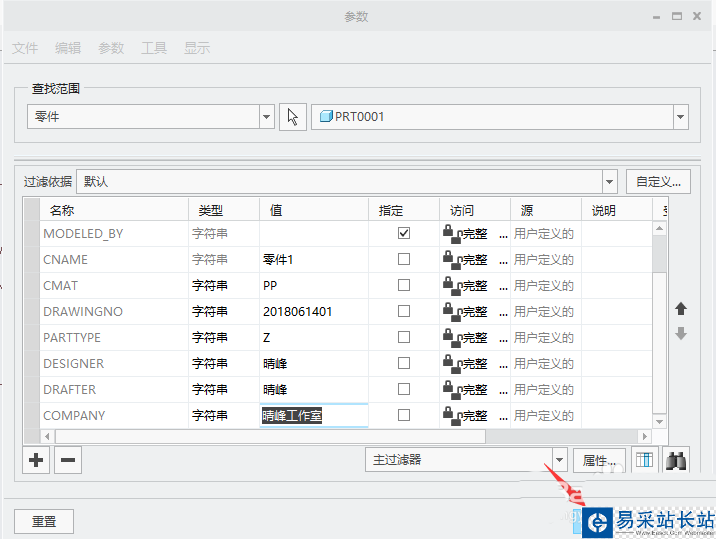 5、按上面的方法定义参数CMAT、DRAWINGNO、PARTTYPE、DESIGNER、DRAFTER、AUDITER、COMPANY,类型都选择字符串。