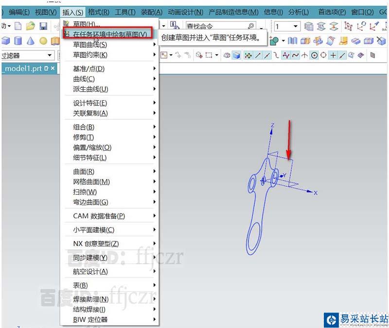 4、再次选用在任务环境绘草图,以XZ面为草图平面;根据上步的截面线绘出3 条参考线。