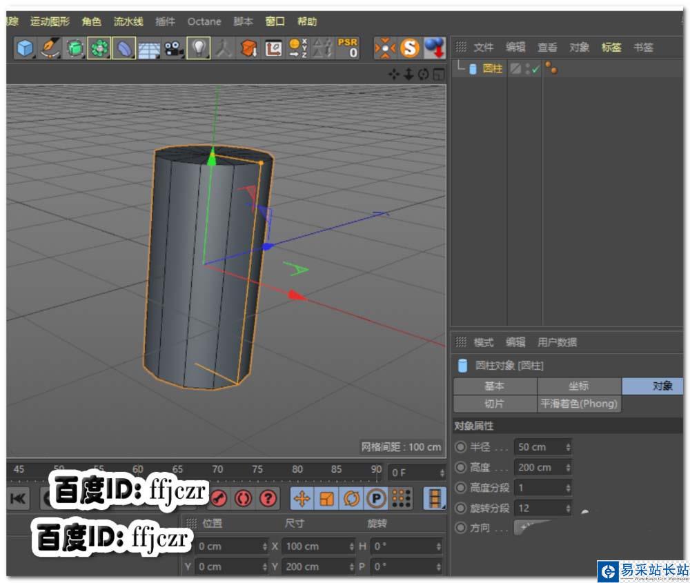 1、新建文件,在工作区中创建圆柱,半径为50,高度为200,高度分段为1,旋转分段为12,方向为+Y。