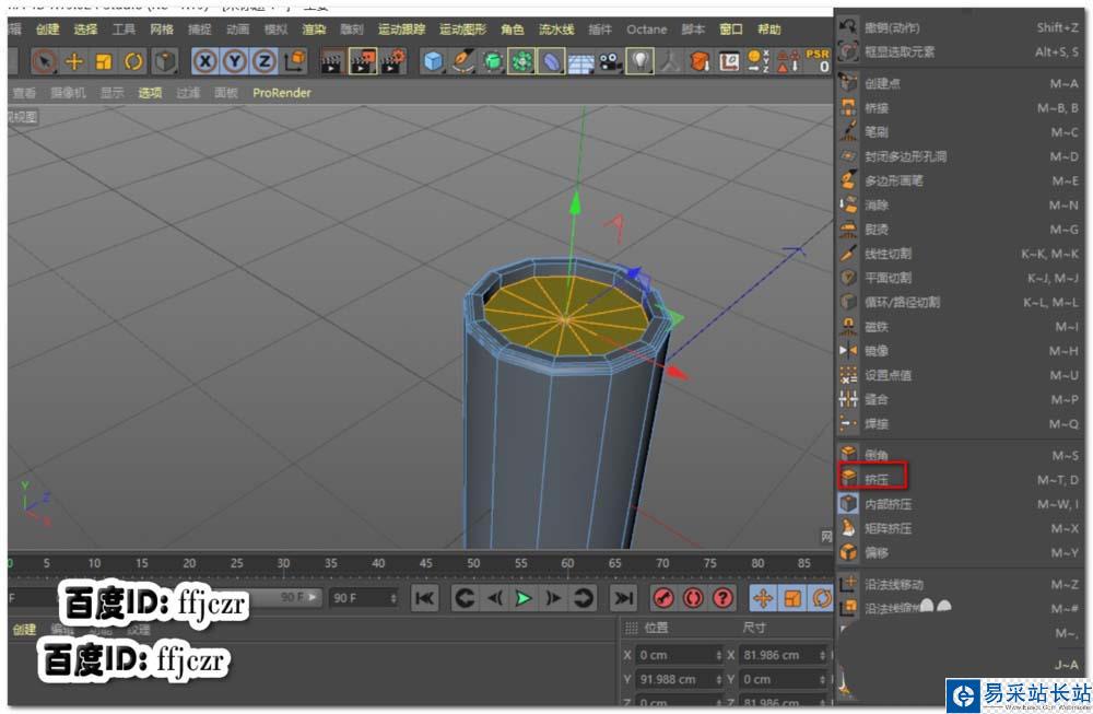 3、在面模式下,选中圆柱体上端面(如图所示),选用内部挤压命令,偏移值为5。