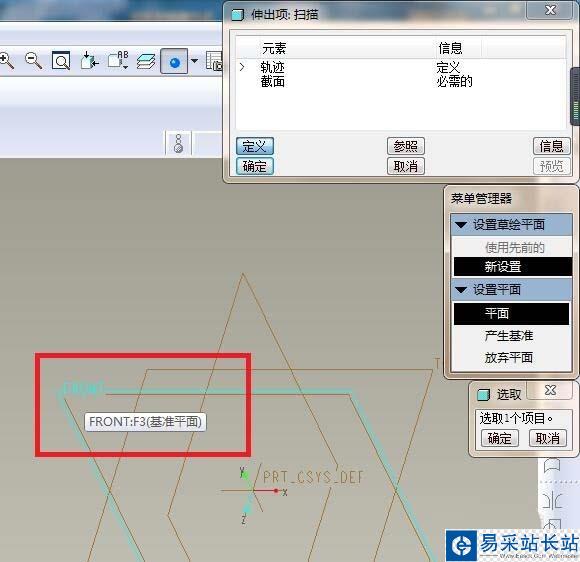 4、如下图所示,菜单管理器点击“FRONT面”为草绘平面,