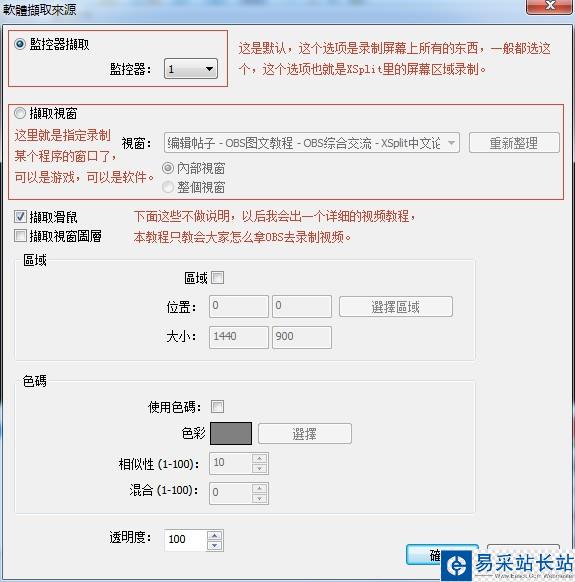 3)看一下上面的图片注释,默认即可点击确定,就可以添加屏幕录制区域了。