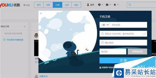 1、首先我们先去注册个优酷视频账号,利用手机号码开通即可。