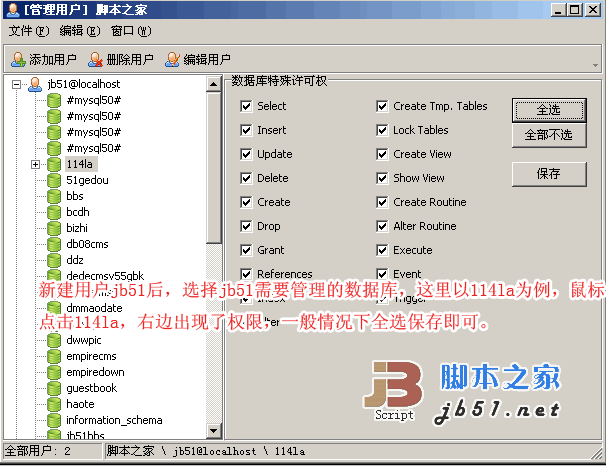 新建用户jb51后,选择jb51需要管理的数据库,这里以114la为例,鼠标点击114la,右边出现了权限,一般情况下全选保存即可。