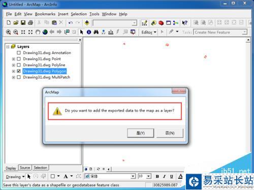 3、这是会弹出一个框,提示你想不想把导出的数据作为这个地图的一个图层,点击“是”会立刻添加到图层,否侧反之;也可以自己手动加载进去,转了都是需要的,一般都会单击“是”。