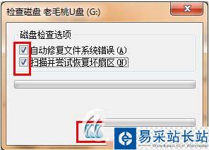 3、接着将磁盘检查选项下自动修复文件系统错误和扫描并尝试恢复坏扇区勾选,再点击“开始”按钮,如下图所示: