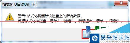 4、随即弹出警告提示执行此任务会删除u盘上所有文件数据。由于开始的时候我们就备份好u盘文件数据,所以点击“确定”按钮,确认执行