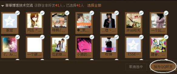 讲到这里,相信菲菲博客的盆友们肯定都明白了吧,这里我就以加QQ群里的好友为例,很简单,展开后选择全部的头像,再点击“加为QQ好友”就OK了。另外加朋友网和微博好友操作几乎都是一样的,这里菲菲就不重复嘞,看图!