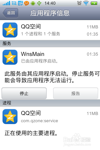 在应用程序信息中点击下方的停止,停止运行QQ空间