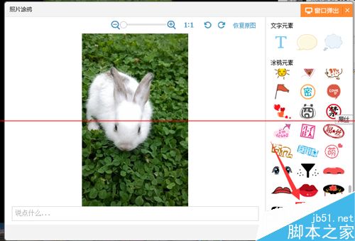 5、点开'涂鸦"的功能后,会呈现如下图所示的模样,在右边的“文字元素”或“涂鸦元素”中选择你要涂鸦的元素,左键点击一下,然后将其拖入到图片中就可以了。