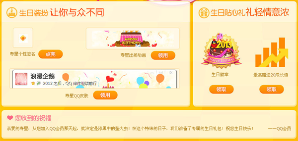 从您加入QQ会员那天起,就注定是漆黑中的萤火虫!在这个特殊的日子,官方推出了QQ会员生日关怀活动,为尊贵的QQ会员用户准备了专属的生日礼包!祝您生日快乐!活动地址:http://vip.qq.com/clubact/2013/birthday/活动流程:进入活动页面,设置生日装扮,领取生日徽章和20点成长值,超级简单。