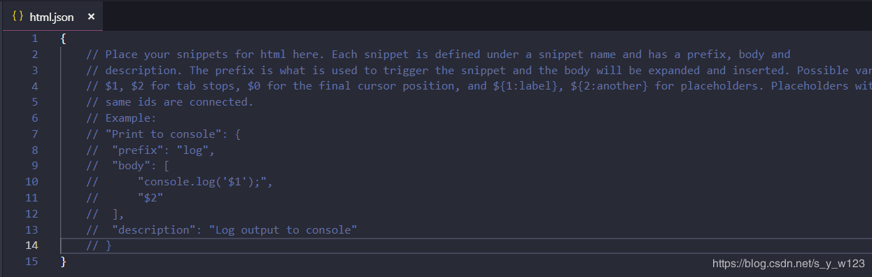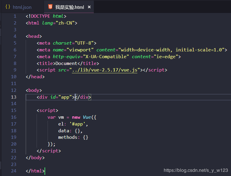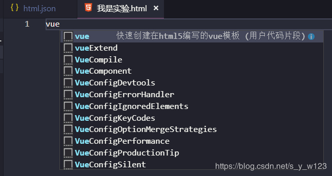 "Html5-Vue": { "prefix": "vue", "body": [ "<!DOCTYPE html>", "<html lang=/"zh-CN/">/n", "<head>", "/t<meta charset=/"UTF-8/">", "/t<meta name=/"viewport/" content=/"width=device-width, initial-scale=1.0/">", "/t<meta http-equiv=/"X-UA-Compatible/" content=/"ie=edge/">", "/t<title>Document</title>", "/t<script src=/"../lib/vue-2.5.17/vue.js/"></script>", "</head>/n", "<body>", "/t<div id=/"app/">$1</div>/n", "/t<script>", "/t/tvar vm = new Vue({", "/t/t/tel: '#app',", "/t/t/tdata: {},", "/t/t/tmethods: {}", "/t/t});", "/t</script>", "</body>/n", "</html>" ], "description": "快速创建在html5编写的vue模板"}把上面的这个模板拷贝到html.json中即可,当然路径要变成自己的本机路径,其余的地方如果看着不舒服也可以自行更改。