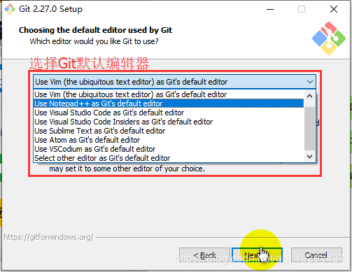 6、选择 Git 编辑器,根据自己的情况选择编辑器(我的电脑上有安装Notepad++),一般就默认选择 Vim 的方式,之后点击【Next】。