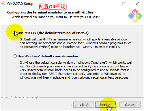 10、配置 Git 终端,使用默认【use MinTTY】,点击【Next】。