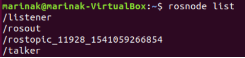 您可以通过该rosnode list命令检查当前运行的节点列表。在我们的示例中,列表将包含talker和listener: