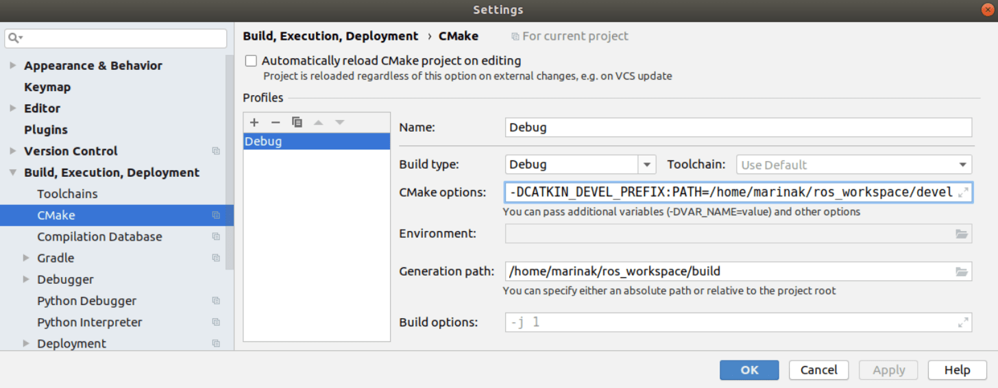 要在IDE和控制台上进行单一构建,需要将CLion构建路径设置为catkin工作区目录。为此,请转到文件|设置Ctrl+Alt+S|构建,执行,部署|CMake并更改两个字段: