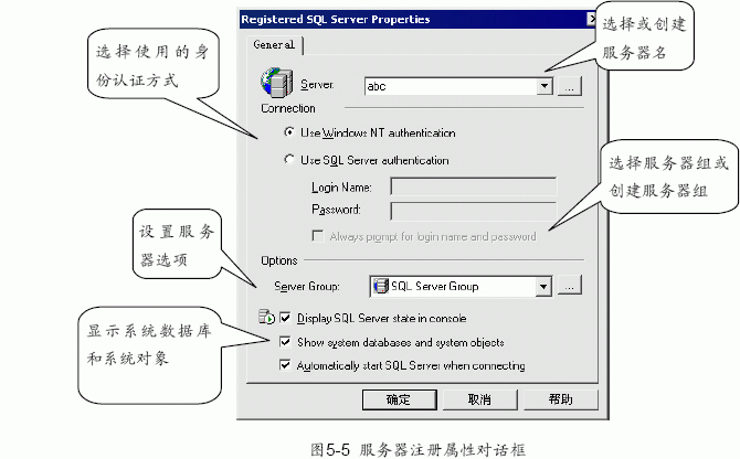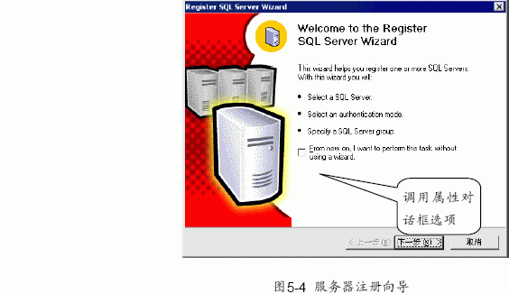 就会出现如图5-4 所示的register sql server wizard (服务器注册向导)对话框。如果在向导对话框的第一个界面中选择了复选框(如图5-4 中所示)后,按下“下一步”按钮就会转换到服务器注册属性对话框界面,如图5-5 所示。也可以用右键单击microsoft sql servers 或sql server group, 从快捷菜单中选择newsql server registration 菜单项。