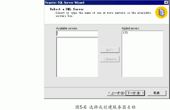 (2) 在register sql server wizard 对话框中不选择复选框,单击“next” 按钮,选择或创建服务器名称。如图5-6 所示。单击“下一步”按钮。