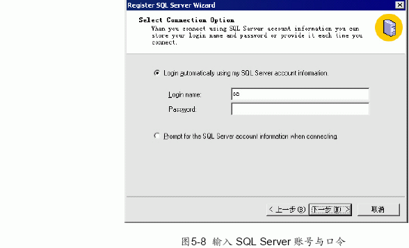 (3) 选择使用的身份认证方式,即windows nt 身份认证或sql server 身份认证。windows nt 身份认证可以使用户只需维护、使用一个windows nt 登录账号和口令,而使用sql server 身份认证则,必须维护windows nt 登录账号和sql server 账号及口令。如图5-7 和图5-8 所示。单击“下一步”按钮,