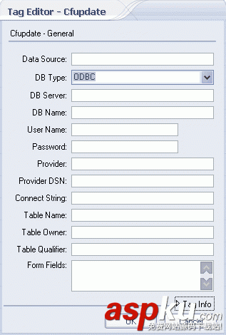 以上经常用到的属性是datasource、tablename和Formfields三个属性,其中datasource是你在coldfusion administrator数据源设定中设置好的名称,tablename是要更新的表,Formfields是和数据库表中字段对应名称一致的form控件名称(注意必须一致才行)。我们看下面的列子: