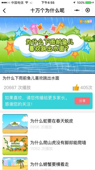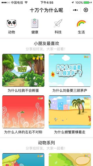 扫码体验小程序十万个为什么幼儿教育动画相当于一本百科全书,分物理、化学、天文气象、农业、生理卫生等。其内容非常广泛,采取一问一答的方式介绍各类科学知识,文字不长,深入浅出,非常符合儿青少年的认知方式和特点。小程序类别:教育开发者:个人小程序截图