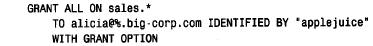 通过授予数据库所有者数据库的所有权限并在操作时指定with grant option,可以允许数据库所有者控制对该数据库的访问。例如,如果要让alicia 能在big.corp.com 域的所有主机中进行连接并管理sales 数据库中所有表的权限,应使用下列grant 语句: