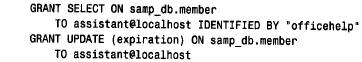 第一条语句授予对整个member 表的读访问权并设置口令。第二条语句增加update权限,但只是对expiration 列。此时不必要再指定口令,因为在第一条语句中已经完成了。