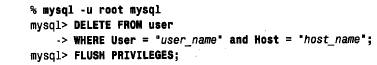 user 部分必须与您想要取消其权限的用户的原始grant 语句的user 部分相匹配。priv i l e g e s 部分不需要匹配,您可用grant 语句授权,然后用revoke 语句取消其中的一部分。revoke 语句只删除权限,不删除用户。用户的项仍然保留在user 表中,即使您取消了该用户的所有权限也是如此。这意味着该用户仍然可连接到服务器上。要想删除整个用户,必须用delete 语句将该用户的记录从user 表中直接删除: