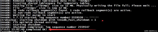 [root@master ~]# innobackupex --user=root --password=pwd123 /opt/mysqlbackup/full/