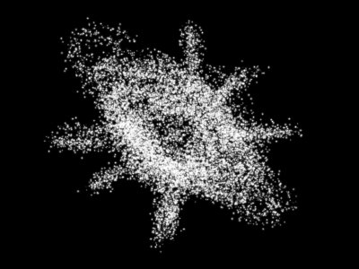 好了,银河画好了。是的,别怀疑,就是这么简单!因为大小抖动和散布的效果,使得笔刷的圆点看上去就和星星一样,明亮不定,大小不一。或许上面的效果还不是能让大家信服,因为这个图像似乎和我们所见的那些科幻电影中的银河看起来相差太远。那好,让我们继续来完善它吧。再使用“星云”画笔在新建层上继续绘制,类似下图。这是什么?昆虫?