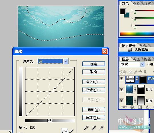 擦好图后,是不是发现这图和背景没接上啊,没关系,把图层模式设置为柔光就可以了,因为我觉得交接还差点,所以把那交接部分选起来,再调整了下曲线(选起来其实很简单的,我原先用的蒙板,所以只需要把蒙板选起来,设置好曲线后把要亮的地方擦出来就行了~)
