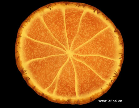 16.我们继续使用20%透明度的画笔,亮黄色将中间的切片、桔子皮周围进行一番修饰,对比一下下图的颜色: