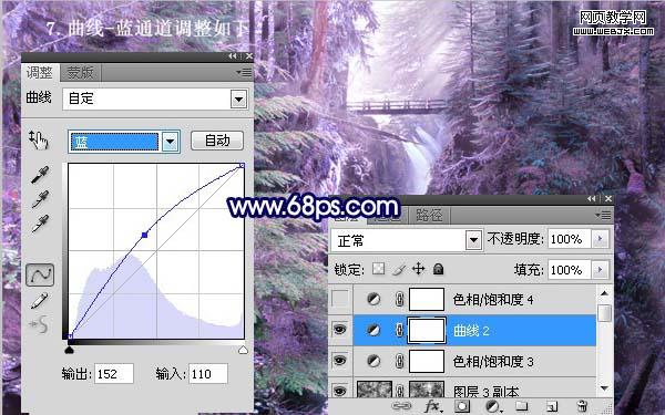 3、创建创建曲线调整图层,对rgb及蓝色进行调整,参数设置如下图,确定后再创建色相/饱和度调整图层,参数设置如下图。