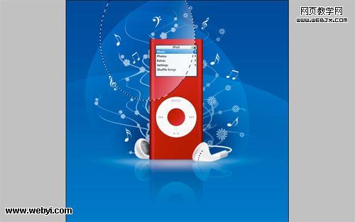 24、昨晚那些后,再一次回到含有ipod图像的图层,载入选区使用选择 >载入选区,接着按下 ctrl+shift+i 反选选区。接着转到白色闪耀的图层按下delete 清除选区。按下 ctrl+d 取消选区。