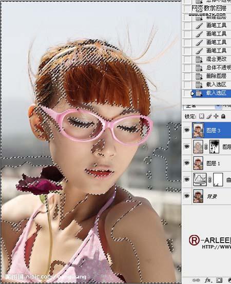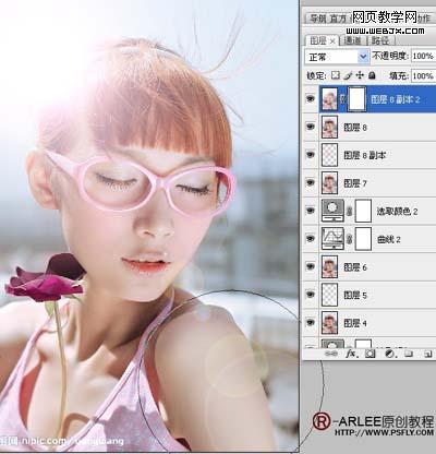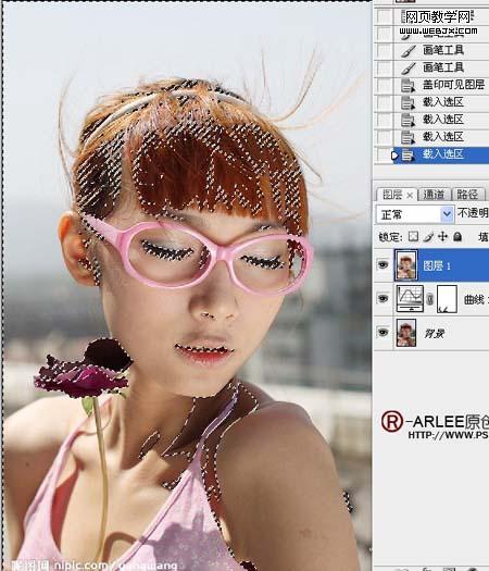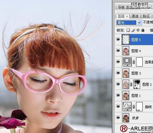 8、盖印可见图层,将花勾选出来,用可选进行调整。 9、新建一个空白图层,用白色画笔,硬度为0,在手臂上涂上一笔。 10、模式改为柔光,现在我们发现手臂有了光感。 11、盖印可见图层。新建曲线调整层。