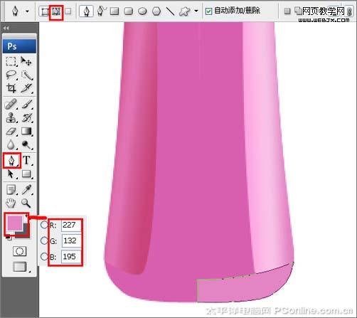 <图13> 11、在图层面板上单击创建新图层按钮 ,新建一个图层,在工具栏中选择钢笔工具,在工作区画出洗发水瓶的底侧形状,在工具箱中选择设置前景色,设置前景色的颜色rgb值分别为227、132、195,填充给洗发水瓶的底侧形状,按键盘快捷键alt+delete填充,接着按键盘快捷键ctrl+d取消选区,如图14所示。
