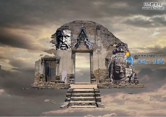 12、选择“曲线2”,打开“素材4”如图21所示。用移动工具拖到文件中,得到图层4.结合自由变换控制框调整图像大小及位置,效果如图22所示。按照第6步的方法使用钢笔工具将佛的头部勾画出来,转换成选取,添加图层蒙版得到如图23所示。