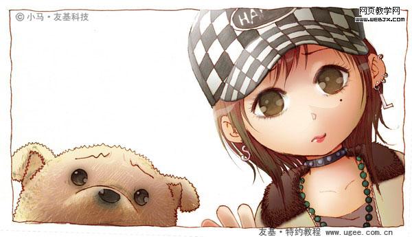 5.现在开始画对象的亮面,新建立一个正常层,将软喷头的画笔调得稍微大一些,用白色在帽子和头发的地方轻轻的喷两下,人物的亮面光感差不多后,把画笔调小,将人物的面部细节刻画一下,如头发的细节,眼睫毛等,同时将宠物的亮面也刻画一下,为了表现一种毛茸茸的感觉,下笔的时候可以随意一些,友基数位板1024级的压感可以很轻松地画出想要的效果,如下图: