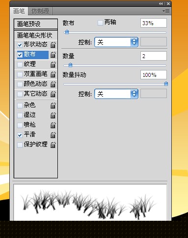 6、在所有图层上方新建“图层1”,按d键将前景色与背景色的颜色值设为默认的黑白,选择画笔工具,按f5调出“画笔”调板,设置参数如图8、9、10、11所示。在黑色形状上方进行拖动直至得到如图12所示的效果。