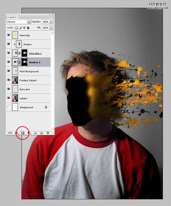 现在我们要做的加点阴影以造就油漆贴在脸上的错觉。首先创建一个新层名为“shadow2”,然后ctrl在“paint map”上单击以选中它。确保“shadow2”还在选中,用黑色填充。