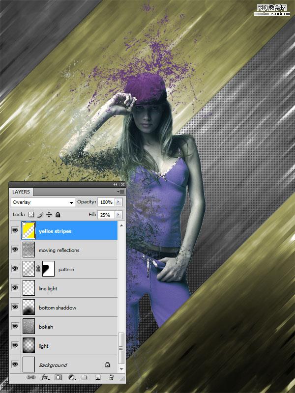 然后我们建立一个新图层,然后应用一些暗黄色的颜色图案,设置图层模式为叠加,填充调整到25%。